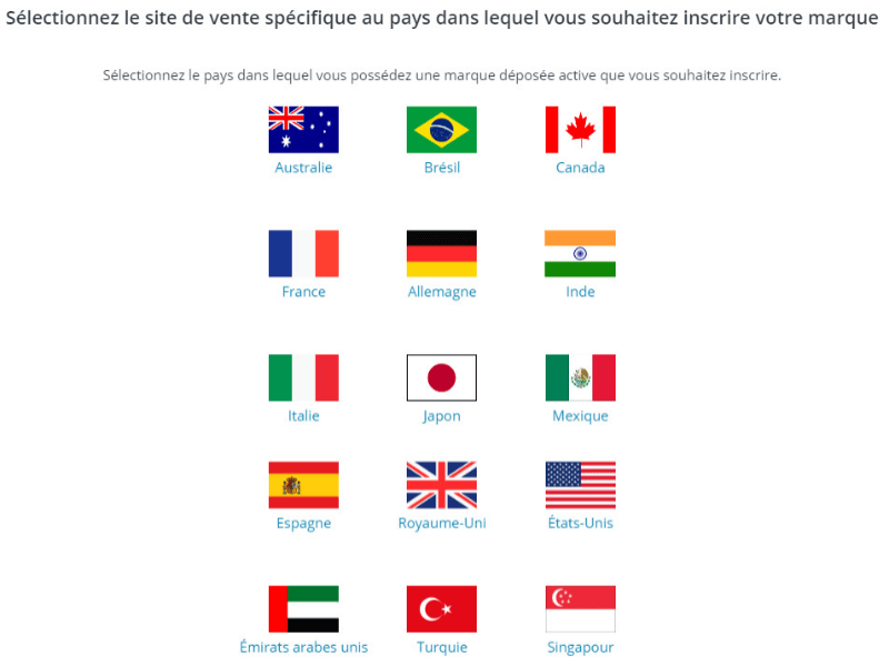 Sélectionnez le site de vente, pays d’enregistrement de la marque :